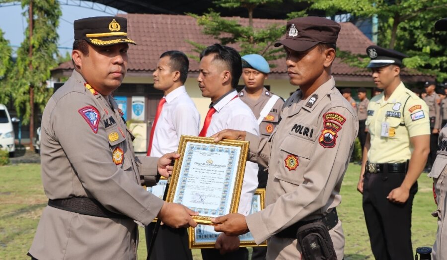 Penghargaan tersebut diserahkan Kapolres dalam upacara kenaikan pangkat PNS Polri dan pemberian penghargaan bagi anggota dan mitra Polri berprestasi yang digelar di Lapangan Wicaksana Leghawa Polres Demak, Senin (1/4/2024).