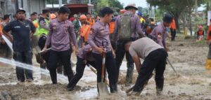 Personel gabungan TNI, Polri, BPBD, PMI bersama masyarakat juga melakukan kerja bakti membersihkan lumpur yang menutup badan jalan guna mempercepat pemulihan akses transportasi.